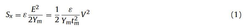 DEA的最大應(yīng)變受到DE擊穿場(chǎng)的限制(更準(zhǔn)確地說(shuō),DEA的失效模式是機(jī)電不穩(wěn)定性[13],但擊穿場(chǎng)是小應(yīng)變致動(dòng)器配置的關(guān)鍵限制因素)。對(duì)于厚度為10μm至100μm的典型彈性體,以及在100–150V/μm的典型彈性體擊穿場(chǎng)附近工作,DEA需要1kV至15kV以達(dá)到最大應(yīng)變。由于高壓電子設(shè)備的成本、尺寸和效率,這些高工作電壓限制了DEA的一些可能應(yīng)用。因此,為了降低DEA的工作電壓,同時(shí)保持相同的驅(qū)動(dòng)性能,進(jìn)行了大量的研究。從式(1)中可以看出,為了在降低電壓的同時(shí)保持給定的驅(qū)動(dòng)應(yīng)變,ε必須增加[9,14],或者Ym和tm必須減少[15,16]。應(yīng)變電壓平方比(Sx/V2)指標(biāo)已用于比較不同工作電壓下DEA的性能[16]。對(duì)于厚度為3μm的DEA,降低膜厚度tm導(dǎo)致先前報(bào)告的最高Sx/V2值為125%/kV2,在245V下產(chǎn)生7.5%的線性應(yīng)變[16]。考慮到電極通常比彈性體更硬(對(duì)于DEAs中使用的幾乎所有材料,Ye>Ym),當(dāng)膜變薄時(shí),電極厚度te或電極剛度Ye也必須進(jìn)一步減小,以保持驅(qū)動(dòng)應(yīng)變,如式(2)所示。