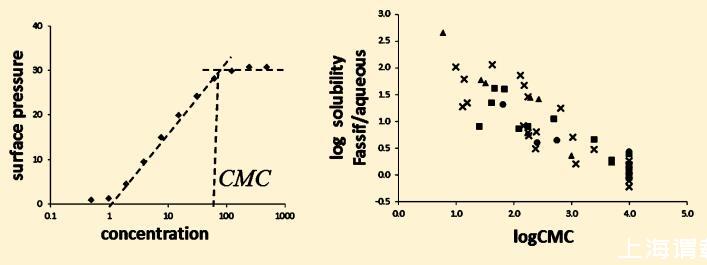 表面張力由一種成熟的體外測定法測定,該測定法通過測量化合物的臨界膠束濃度和兩親性來評(píng)估化合物的表面活性劑性質(zhì)。 兩親性是用于量化化合物與生物膜親和力的一個(gè)關(guān)鍵屬性,在制藥工業(yè)中廣泛用于預(yù)測藥物誘導(dǎo)的磷脂病,11,12 ? 腦屏障滲透,13和藥物淋巴吸收。 14在這項(xiàng)工作中,我們同樣評(píng)估了化合物對(duì)生物相關(guān)介質(zhì)中所含膠束的親和力是否可以用化合物固有的表面活性劑性質(zhì)來解釋。 因此,我們對(duì)不同化合物的表面活性劑性質(zhì)進(jìn)行了表征,以將此類表面活性性質(zhì)與FaSSIF中觀察到的與水介質(zhì)溶解度相比的溶解度增強(qiáng)程度相關(guān)聯(lián)。 共分析了51個(gè)分子,包括上市藥物和羅氏專利化合物,具有廣泛的溶解性、親脂性和電離狀態(tài)。