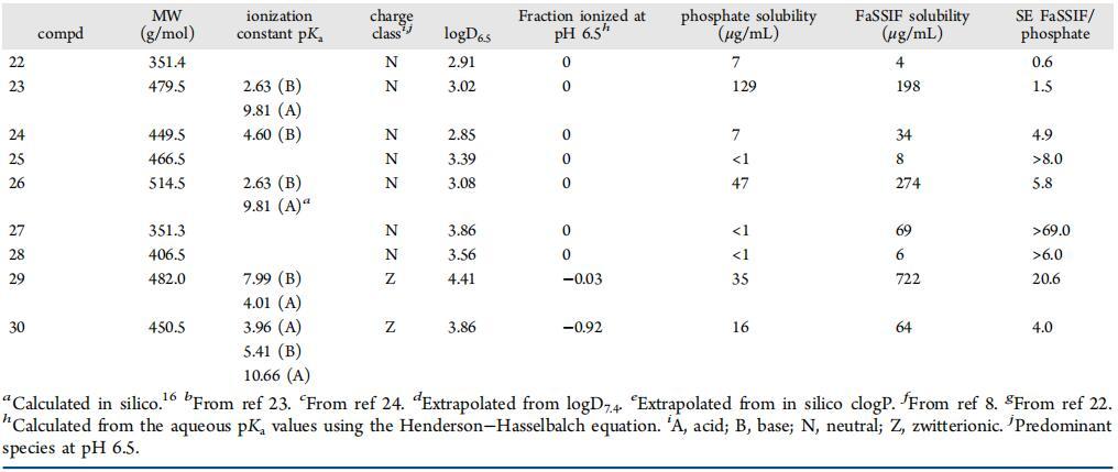 以前曾使用一組參考化合物觀察到,電離酸性化合物的硒通常低于電離堿。結(jié)果表明,由于與帶負(fù)電荷的FaSSIF介質(zhì)組分之間的靜電排斥作用,離子酸在FaSSIF中的溶解度沒有增加。8在目前的研究中,對(duì)于幾個(gè)涵蓋更廣泛化學(xué)空間的專利化合物,我們沒有發(fā)現(xiàn)離子化酸或堿之間硒的任何顯著溶解度差異,這表明靜電相互作用可能被其他因素掩蓋或覆蓋,如化合物的構(gòu)象和親油性。