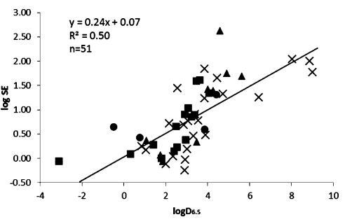 圖2。在pH值為6.5時(shí),51種化合物的溶解度增強(qiáng)(SE=S_-FaSSIF/S_-水溶液)是辛醇/水分配系數(shù)的函數(shù)?;衔锉粴w類為酸(■),基地(▲),中性(×)和兩性離子(●).高于或低于檢測(cè)限的值在檢測(cè)限處繪制。