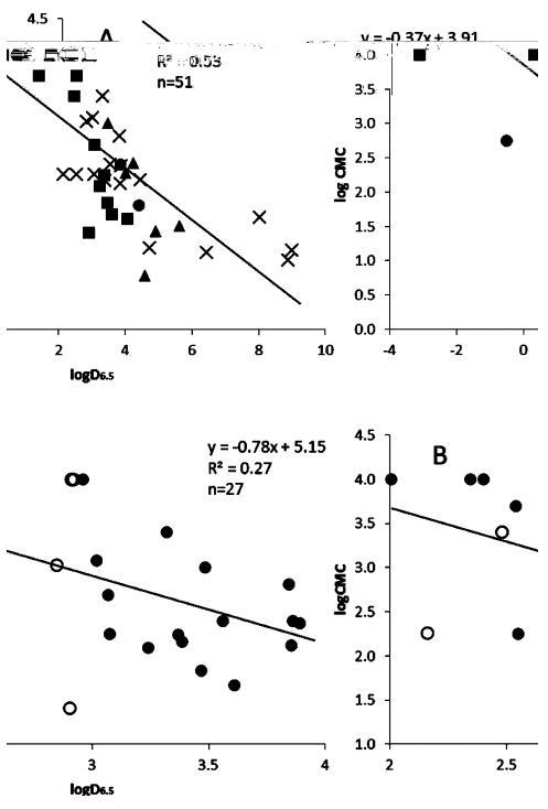 圖6。對(duì)于分類為酸的完整化合物組(A),根據(jù)pH 6.5(logD6.5)下的辛醇分配系數(shù)繪制對(duì)數(shù)CMC(μM)(■),基地(▲),中性離子(x)和兩性離子(?),以及l(fā)ogd2和logd4(B)范圍內(nèi)的化合物。圖B中的開放圓對(duì)應(yīng)于從文獻(xiàn)檢索、預(yù)測(cè)或從pH值為7.4的logD推斷的logD值。高于或低于檢測(cè)限的值在檢測(cè)限處繪制。