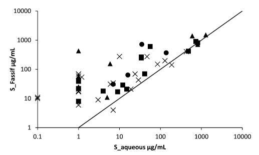 圖1。測(cè)定了51種化合物在磷酸鹽和FaSSIF緩沖液中pH值為6.5時(shí)的平衡溶解度?;衔锉粴w類為酸(■),基地(▲),中性(×)和兩性離子(●).線對(duì)應(yīng)于單位線。低于檢測(cè)限的值在檢測(cè)限處繪制。