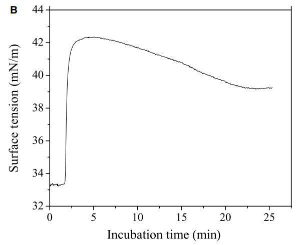 圖5:(A)使用活/死試劑盒測(cè)定的肽CL-7誘導(dǎo)A549細(xì)胞膜損傷的動(dòng)力學(xué)。在不同時(shí)間點(diǎn)添加肽溶液后拍攝熒光圖像。計(jì)算綠色像素占總綠色和紅色像素的百分比,以估計(jì)細(xì)胞膜的完整性。(B)肽CL-7結(jié)合和插入引起脂質(zhì)單層的表面張力變化(DPPC/膽固醇/DPPS=50/10/2.5)。肽濃度保持在10 lM,脂質(zhì)單層的初始表面張力設(shè)定為33 mN/m。