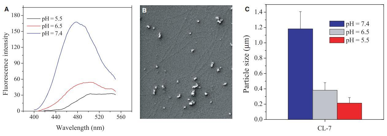 圖6:(A)pH值影響不同pH值下溶液(40 lM)中CL-7的聚集。1-苯胺基萘-8-磺酸(1,8-ANS)濃度固定在20 lM,激發(fā)波長(zhǎng)設(shè)置為369 nm。肽聚集溶解通過1,8-ANS發(fā)射峰在500 nm處的紅移和熒光強(qiáng)度降低來指示;(B)pH=7.4的40 lM肽溶液中形成的CL-7聚集體的掃描電子顯微鏡圖像;(C)隔夜培養(yǎng)后測(cè)量溶液中肽CL-7(80 lM)的粒徑。數(shù)據(jù)代表至少三個(gè)獨(dú)立測(cè)試的平均值和標(biāo)準(zhǔn)差。