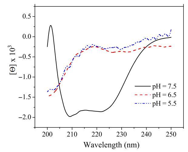 除了肽聚集狀態(tài)外,細(xì)胞表面pH值也可能影響pH敏感肽的二級(jí)結(jié)構(gòu)。已經(jīng)發(fā)現(xiàn),肽插入細(xì)胞膜通常伴隨著肽二級(jí)結(jié)構(gòu)的變化(17)。肽鏈折疊成特定構(gòu)象,通常為α螺旋結(jié)構(gòu),這被證明是肽插入細(xì)胞膜的必要過程(6)。盡管所有選定的pH敏感裂解肽在生理pH下均采用螺旋結(jié)構(gòu),但當(dāng)環(huán)境pH降至肽的過渡pH以下時(shí),它們變成隨機(jī)線圈(表2和圖7)。從無規(guī)螺旋轉(zhuǎn)變?yōu)槁菪请牟迦肽さ哪芰坑欣^程(6)。因此,細(xì)胞表面pH值也可能通過改變pH敏感肽的二級(jí)結(jié)構(gòu)而影響其活性。