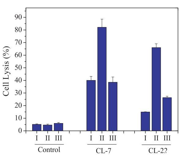 圖4:在CHO-K1細(xì)胞(I)、用8-CPT-cAMP處理的CHO-K1細(xì)胞(II)和用8-CPT-cAMP處理的CHO-K1細(xì)胞上測(cè)試的細(xì)胞表面pHs調(diào)節(jié)PH敏感裂解肽CL-7和CL-22的細(xì)胞裂解活性,然后是巴絲霉素A1(III)。表3提供了不同處理對(duì)應(yīng)的細(xì)胞表面pHs。在所有實(shí)驗(yàn)中,肽濃度固定在40 lM。對(duì)照組未添加肽。對(duì)照空白對(duì)照組和100%裂解對(duì)照組,將細(xì)胞裂解(乳酸脫氫酶釋放)標(biāo)準(zhǔn)化為細(xì)胞死亡百分比。數(shù)據(jù)代表至少三個(gè)獨(dú)立測(cè)試的平均值和標(biāo)準(zhǔn)差。