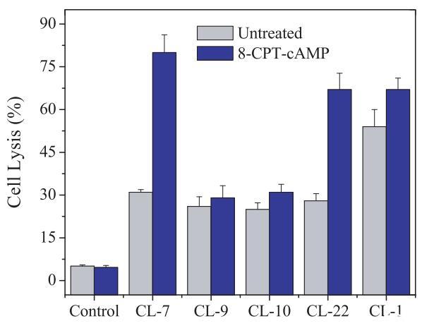 為了排除上述結(jié)果由CHO-K1細(xì)胞的某些固有特性引起的可能性,我們?cè)诹硪粋€(gè)選定的細(xì)胞A549上進(jìn)行了相同的實(shí)驗(yàn),其細(xì)胞表面電荷與CHOK1細(xì)胞幾乎相同(表1)。由于肽將受到來自A549和CHO-K1細(xì)胞的相同拉力,靜電吸引對(duì)肽-細(xì)胞相互作用的潛在影響被最小化或消除。A549細(xì)胞的表面pH值為7.15,高于肽CL-9、CL-10和CL-22的過渡pH值,但低于肽CL-7的過渡pH值(pH值為7.35)。同樣,CL-7被證明是A549細(xì)胞上最活躍的肽(圖3)。在存在8-CPT-cAMP的情況下,A549細(xì)胞的表面pH值降低至pH=6.55(表3),低于所有受試裂解肽的過渡pH值(表1)。因此,四種pH敏感裂解肽對(duì)8-CPTcAMP處理的A549細(xì)胞的裂解活性顯著增加(圖3)。應(yīng)注意的是,與pH敏感肽不同,當(dāng)細(xì)胞被8-CPT-cAMP處理時(shí),pH不敏感肽CL-1對(duì)A549和CHO-K1細(xì)胞的活性幾乎沒有變化(圖2和圖3)。