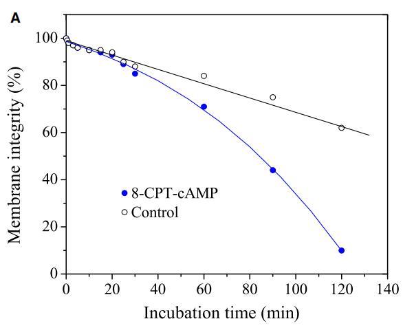 肽與細(xì)胞膜的相互作用包括三個(gè)步驟:(i)陽離子肽對(duì)細(xì)胞表面的靜電吸引;(ii)肽向結(jié)合平面的轉(zhuǎn)變;(iii)將肽插入細(xì)胞膜。通過研究pH敏感肽CL-7誘導(dǎo)的膜損傷動(dòng)力學(xué),研究了肽-細(xì)胞相互作用的細(xì)節(jié)(圖5A)。CL-7誘導(dǎo)的A549細(xì)胞膜滲漏呈時(shí)間依賴性,并呈線性曲線。盡管在8-CPT-cAMP處理的A549細(xì)胞上,CL-7介導(dǎo)的細(xì)胞膜損傷在開始時(shí)遵循相同的曲線,但它偏離了線性曲線,并在培養(yǎng)15-20分鐘后加速(圖5A)。在脂質(zhì)單層膜上進(jìn)行的平行膜張力研究表明,CL-7與細(xì)胞膜的相互作用以表面張力快速增加的初始階段為特征,隨后是表面張力松弛的第二階段(圖5B),與肽與膜結(jié)合和肽插入相關(guān)膜,分別。盡管CL-7與脂膜結(jié)合是一個(gè)快速過程(3-5分鐘),但肽插入脂膜大約需要20分鐘才能完成。這兩個(gè)實(shí)驗(yàn)的結(jié)果非常吻合,這意味著細(xì)胞表面pH對(duì)CL-7的顯著影響發(fā)生在肽-細(xì)胞相互作用的后期,即肽插入細(xì)胞膜。