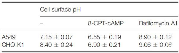 表3:8-CPT-cAMP-和巴非霉素A1在具有生理pH的培養(yǎng)基中誘導(dǎo)的細(xì)胞表面pH變化
