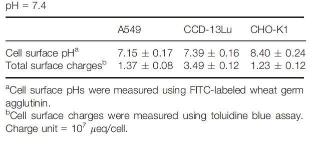 雖然細(xì)胞外環(huán)境通過影響細(xì)胞表面和整體溶液之間的質(zhì)子交換而影響細(xì)胞表面pH值,但在pH值固定的生理?xiàng)l件下,細(xì)胞表面pH值將由細(xì)胞的化學(xué)和生物學(xué)特性決定,包括細(xì)胞的質(zhì)子生產(chǎn)能力、細(xì)胞大小、細(xì)胞的大小、細(xì)胞的大小、細(xì)胞的大小、細(xì)胞的大小、細(xì)胞的大小、細(xì)胞的大小、細(xì)胞的大小、細(xì)胞的大小以及細(xì)胞的大小,以及細(xì)胞表面的pH緩沖能力。因此,在生理?xiàng)l件下,組織細(xì)胞可能具有特定的甚至可區(qū)分的表面pHs。我們測(cè)量了一組來自不同器官/組織的細(xì)胞在生理pH下的細(xì)胞表面pH值,發(fā)現(xiàn)所有受試細(xì)胞都具有不同的表面pH值(表1)。