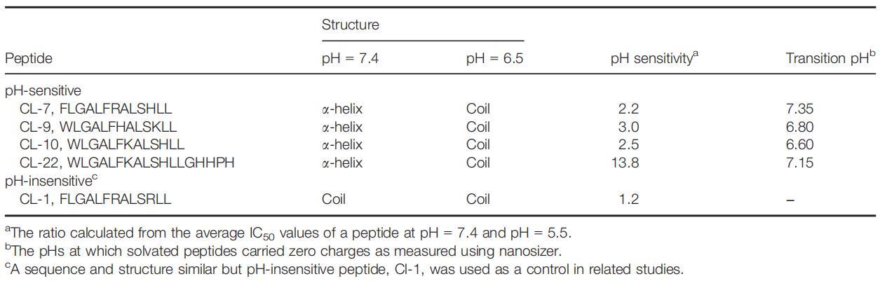 肽CL-1是一種pH不敏感的裂解肽(表2)。盡管其序列和結(jié)構(gòu)與其他pH敏感肽相似,但其細(xì)胞裂解活性幾乎不受pH的影響。本研究以肽CL-1作為陰性對(duì)照。