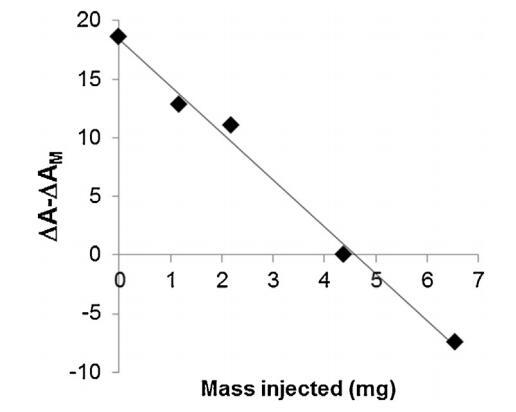 脂質(zhì)體(不同濃度)對BSP蛋白的作用也如圖5所示。脂質(zhì)體在進入亞階段前與精漿接觸。隨著脂質(zhì)體中濃度的增加(曲線M/SP+C1至C4),BSP蛋白吸附引起的表面積增加逐漸延遲并減少。當含量達到4.37 mg(C3)時,界面上仍有少量BSP蛋白摻入,1600 s時出現(xiàn)肩部。在最高濃度(C4)下,未觀察到BSP蛋白摻入,分子面積的變化甚至比對照曲線更負,表明膜組分在亞相中輕微溶解。因此,脂質(zhì)體作用于BSP蛋白的方式與LDL相同。最有趣的比例似乎介于C3和C4之間。根據(jù)確定面積變化與脂質(zhì)體注射磷脂質(zhì)量之間相互作用的曲線計算得出(圖6)。注射26.6 mg BSP的最佳質(zhì)量為4.6 mg,即PC:BSP比為0.16(w/w)。
