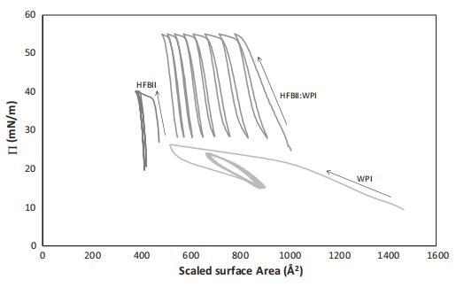 圖4。?/A-純HFBII、純WPI及其1:10混合物的吸附系統(tǒng)的等溫線,所有這些系統(tǒng)的總蛋白質(zhì)濃度均為0.1 mg/ml。等溫線包括第一個(gè)壓縮/膨脹循環(huán)和5個(gè)滯后環(huán)。將HFBII和WPI的表面積縮放至攤鋪系統(tǒng)曲線中彎曲點(diǎn)的出現(xiàn),對應(yīng)于表面的明顯緊密堆積過渡(圖1)。