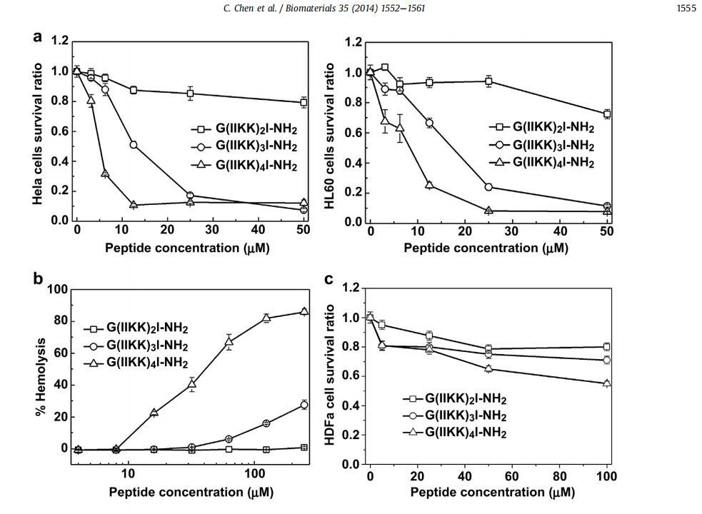 開發(fā)對(duì)宿主細(xì)胞具有良好生物相容性但對(duì)癌細(xì)胞具有高效力的功能性生物材料和藥物是一項(xiàng)具有挑戰(zhàn)性的工作。通過利用天然抗菌肽和a-螺旋蛋白的優(yōu)勢(shì)特性,我們?cè)O(shè)計(jì)了一類新的短a-螺旋肽G(IIKK)nI-NH2(n細(xì)胞)。我們表明,含有?n1e4的肽具有不同的效力和對(duì)癌癥?3和4的高選擇性,能夠有效殺死癌細(xì)胞,同時(shí)在其工作濃度下對(duì)宿主細(xì)胞保持良性,通過類似于殺菌效果的機(jī)械過程。細(xì)胞的高選擇性可能源于它們優(yōu)先與帶有負(fù)電荷和高流動(dòng)性的細(xì)胞外膜結(jié)合。除了快速透膜能力外,這些肽還可以通過線粒體途徑和死亡受體途徑誘導(dǎo)癌細(xì)胞的程序性細(xì)胞死亡,而不會(huì)誘導(dǎo)非特異性免疫原性反應(yīng)。重要的是,這些肽還可以在小鼠異種移植模型中抑制腫瘤生長,而不會(huì)引起副作用。雖然這項(xiàng)研究揭示了這些肽作為強(qiáng)效藥物和其他醫(yī)療保健應(yīng)用的臨床潛力,但它也指出了基礎(chǔ)材料研究在高選擇性肽功能材料未來發(fā)展中的重要性。