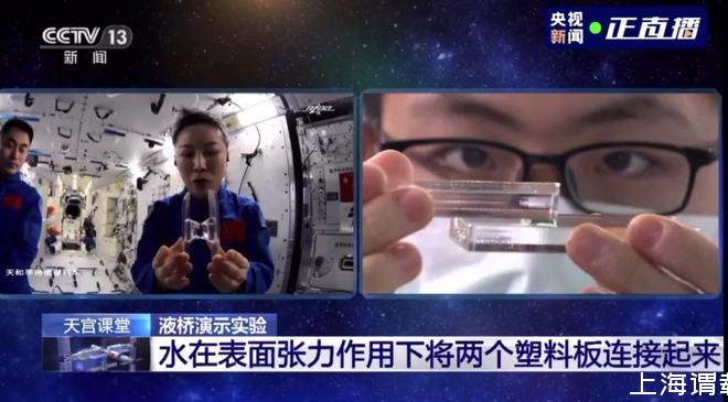 王亞平解釋,在地面重力的環(huán)境下,水的表面張力微不足道,所以同學(xué)們無法用純水做出一個液橋。而在太空中,由于重力消失,液體表面張力就可以用液體搭建出一座橋。