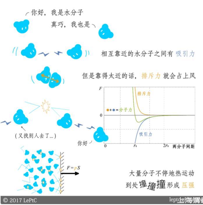 假設(shè)上下兩部分的壓強相同(壓強不同的情況將在第二節(jié)介紹),由于空氣對水分子的吸引力小于水分子之間的吸引力,所以位于表面的水分子會受到指向液體內(nèi)部的力,一部分水分子被拉進液體內(nèi)部,表面層的水分子開始變稀疏,直到吸引力減弱到和空氣接近時趨于平衡。表面層水分子的間距大于r0,因此吸引力占上風(fēng):