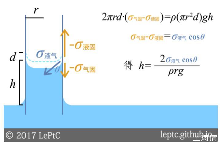 講到這里,我們已經(jīng)有三種方法來解釋這個現(xiàn)象了:①水想增加自己跟玻璃管內(nèi)壁的接觸面積,直到表面能的消耗不足以補償重力勢能;②固液接觸面的負張力把液體向上拉;③凹液面會降低液體內(nèi)的壓強,從而外部氣壓把液體壓上來。三種方法都能推導(dǎo)出相同的結(jié)論,下圖中給出了第一種推法。