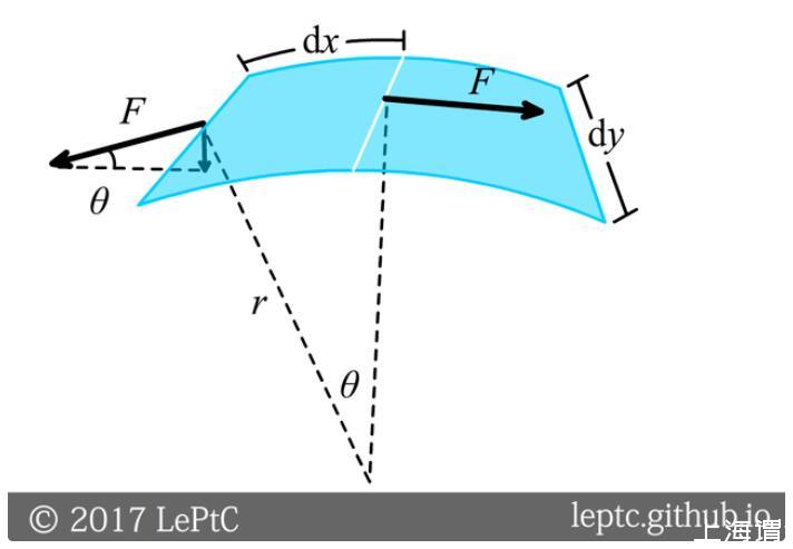 假設(shè)膜在x的方向彎曲,曲率半徑為r,作用在一個微小的長度dy上的表面張力F=σdy,sinθ≈dx/r,指向球內(nèi)的合力為Fsinθ=σdxdy/r(沒有乘2是因為每條邊的力被相鄰兩個面元共用),這一力由壓強差平衡,除以面積dxdy得壓強差為σ/r。對于球面x和y方向都彎,故球內(nèi)壓強比球外大2σ/r(對于肥皂泡因為有兩層界面還要再乘2)。