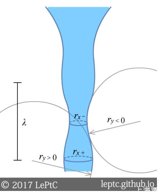 這一現(xiàn)象稱為普拉托-瑞利不穩(wěn)定性(Plateau–Rayleigh instability)。我們在柱狀界面上加一個波長為λ的擾動,橫截面上的曲率變化rx是促進柱的分裂的,但縱截面上ry的曲率變化會阻礙分裂,后者的效應(yīng)隨λ變長而減弱。