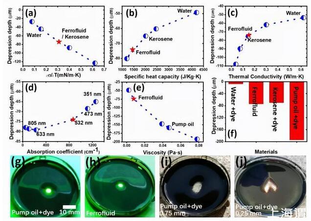 他們發(fā)現(xiàn),液體的厚度、表面張力的溫度系數(shù)、熱導(dǎo)、比熱容、吸光性和粘度等物理參數(shù),都會(huì)對(duì)光致液體形變產(chǎn)生重要影響,尤其是吸光系數(shù)和液體的表面張力溫度系數(shù)。