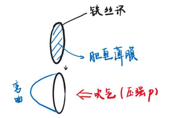 這時,咱們在一側吹氣(相當于施加了一個壓強),平整的薄膜就發(fā)生“彎曲”——