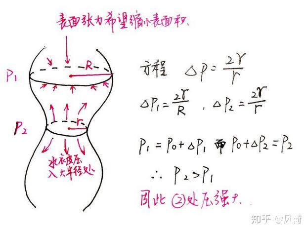 表面張力會(huì)像皮筋一樣收縮液體的表面積,同時(shí)壓力大(半徑?。┑牡胤降乃粩D到半徑大的地方,使得本來細(xì)的地方半徑變得更小。