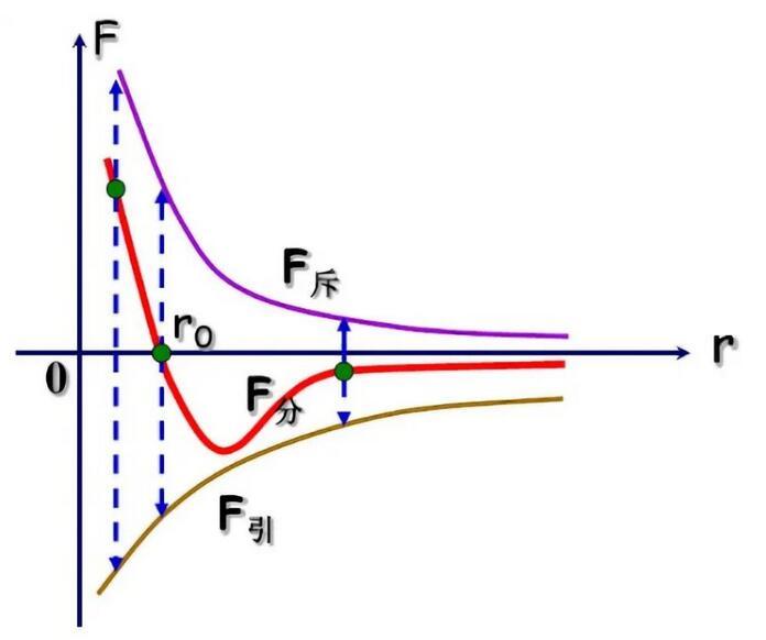 關(guān)于分子間作用力的組成、產(chǎn)生原因等十分復(fù)雜,今天并不去過多介紹。不過我們需要了解的是,在分子間作用力的影響因素中,分子間距是極其重要的一個。兩者具體的關(guān)系如下圖所示: