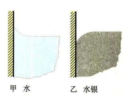 那有沒有玻璃分子不喜歡的人呢?當(dāng)然,水銀分子相對于玻璃就是非浸潤液體,所以我們會觀察到,沒有器壁玻璃分子的拉力,試管內(nèi)的水銀液面就?是凸出來的。