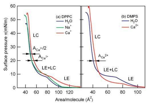 對于1 M Ca2+溶液上的DMPS單分子膜,與觀察到的純水共存區(qū)的π)10 mN/M壓力相比,LE+LC平臺壓力降低到π)5 mN/M;在較高的表面壓力(π>20 mN/m)下,兩條等溫線的位移保持等于Ca2+足跡,4?2/脂,未觀察到明顯轉變?yōu)?:1脂/Ca2+復合物。