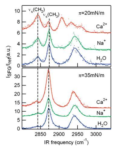 振動和頻發(fā)生光譜學(VSFG)。VSFG是一種非線性振動光譜技術,可提供界面分子構象順序和方向的表面特定信息,進一步研究了在Ca2+存在下這種改變相行為的分子起源。21,22為了量化離子對脂質尾部構象的影響,在C-H拉伸區(qū)域收集VSFG光譜。沿等溫線測量了幾個表面壓力的光譜;圖5顯示了DPPC單層在20 mN/m和35 mN/m下三種不同亞相的光譜。可以觀察到五種振動模式:以2876、2970和2938 cm-1為中心的峰值分別歸屬于CH3對稱拉伸、CH3反對稱拉伸和CH3費米共振。22 CH2對稱和反對稱拉伸頻率約為2846和2920 cm-1。氘化DPPC脂質單層(d62和d75 DPPC)上的VSFG實驗顯示膽堿C-H伸展的信號非常低。