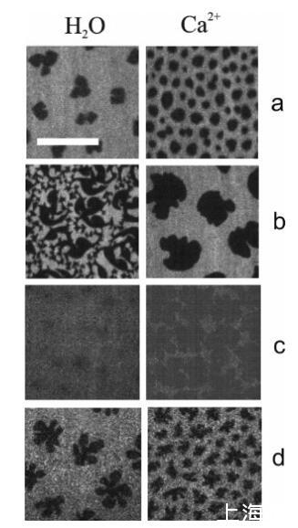圖3:水上DPPC(a、b、c)和DMPS(d)單層的熒光圖像(左圖)和1 M CaCl2溶液(右圖),π)4 mN/M(a)、π)6.5 mN/M(b)、π)35 mN/M(c)和π)2 mN/M(d)。單分子膜用5 mol%羅丹明PE標記:亮區(qū)對應于LE相,暗區(qū)為LC結構域。比例尺代表15μm。所有圖像的對比度都相同。