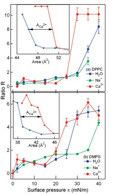 圖6:。作為DPPC(a)和DMPS(b)單分子膜表面壓力的函數(shù),CH3和CH2對稱拉伸振子強度的比值R:純水(藍色)、1 M NaCl溶液(綠色)和1 M CaCl2溶液(紅色)。由于單分子膜的崩塌,在π)40 mN/m時,無法測定Na+-DPPC的比值R。由于壓縮單層膜的νsCH2振幅的不確定性,在較高壓力下,誤差條較大。插圖顯示了作為每種脂質面積函數(shù)顯示的比率R。請注意~4?2/脂質置換(解釋為Ca2+足跡),與圖2中的等溫線一致。