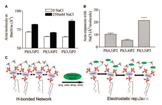 圖5:。亞相氯化鈉膨脹效應(yīng)的PIP2異構(gòu)體特異性。(A)HEPES緩沖亞相上的DO-PIP2異構(gòu)體在π)30 mN/m時(shí)的每分子面積。平均值(SE,n)7。(B)250 mM NaCl和無亞相NaCl之間DOPIP2異構(gòu)體的每分子面積差異。通過雙向ANOVA測(cè)量,NaCl效應(yīng)的異構(gòu)體依賴性顯著達(dá)到p)0.0001。(C)PIP2分子間相互作用的概念動(dòng)畫。在沒有潮向性試劑(綠色橢圓)的情況下,PIP2分子形成水介導(dǎo)的氫鍵網(wǎng)絡(luò)。當(dāng)添加潮向性聚合物時(shí),網(wǎng)絡(luò)被破壞,帶電磷酸鹽之間的靜電排斥導(dǎo)致單層的膨脹。