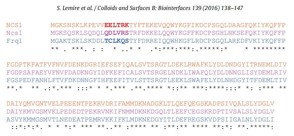 圖1.人類NCS1(橙色)、裂變酵母NCS1(粉紅色)和芽殖酵母Frq1(藍色)的序列比對。在鈣存在和不存在的情況下,負責肉豆蔻基擠出的基序用紅色表示[29](為了解釋本圖例中對顏色的引用,讀者請參閱本文的網(wǎng)絡(luò)版本)。