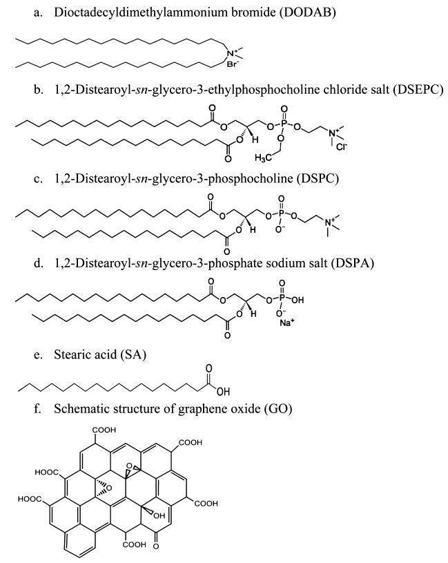 正電荷脂質二十八烷基二甲基溴化銨(DODAB)和1,2-二硬脂酰-sn-甘油-3-乙基磷酸膽堿氯化鹽(DSEPC)、中性電荷兩性脂質1,2-二硬脂酰-sn-甘油-3-磷酸膽堿(DSPC)和負電荷脂質1,2-二硬脂酰-sn-甘油-3-磷酸鈉鹽(DSPA)購自Avanti Polar Lipides(Alabaster,AL)。硬脂酸(SA)購自SigmaAldrich(密蘇里州圣路易斯)。由于頭部基團中存在陰離子磷酸鹽和陽離子季銨中心,DSPC帶中性電荷,如方案1c所示。由于羧基脫質子化,SA被認為是帶負電的分子。所有這些脂質在非極性尾部都有18個碳鏈烷基。光譜級氯仿和甲醇來自MP Biomedicals(Solon,OH)。單層GO購自ACS Material LLC(馬薩諸塞州梅德福德)。所有這些化學品均未經任何進一步凈化?;瘜W結構如圖1所示。實驗中使用的去離子水來自Modulab 2020水凈化系統(tǒng)(德克薩斯州圣安東尼奧)。去離子水的電阻率、表面張力和pH值在20.0±0.5°C時分別為18 MΩ·cm、72.6 mN/M和5.6。所有實驗均在恒溫20.0±0.5°C、濕度50±1%的潔凈室(1000級)中進行。