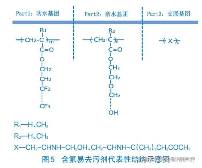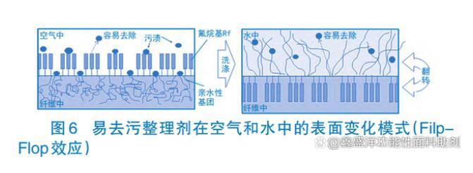 圖5為含氟易去污劑的主要結(jié)構(gòu)含氟易去污整理劑分子中既含有防水防油基團(tuán)——全氟烷基丙烯酸酯聚合物,又含有親水基團(tuán)——聚氧乙烯鏈等。織物經(jīng)整理后全氟烷基鏈段定向排列在纖維表面,排斥水性和油性污物,使其不易沾污。如果織物被污物沾附,在水洗液洗滌時(shí),親水性鏈段定向排列在纖維與液體的界面上,吸引水分子,提高其易去污性能(也叫Filp-Flop,反轉(zhuǎn)凈洗效應(yīng))??椢锼春蠛娓桑H水鏈段脫水,氟烷鏈段重回其主導(dǎo)地位,再度呈現(xiàn)良好的防水防油性能。