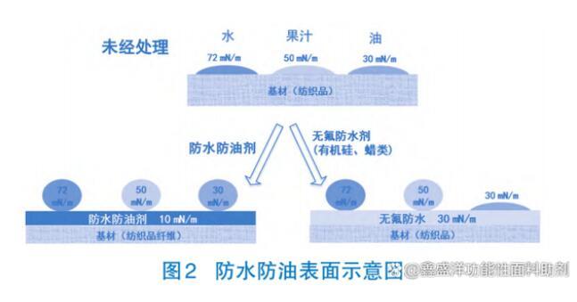 圖2中展示了,含氟防水防油劑通過(guò)降低纖維表面張力,達(dá)到優(yōu)異的防水防油效果。如通常棉的臨界表面張力為γc≈200 mN/m,而常溫下水、果汁、油的表面張力分別為72、50、30mN/m,所以棉很容易被以上液體潤(rùn)濕。經(jīng)過(guò)含氟整理劑處理后,棉纖維表面張力下降至約10 mN/m,呈現(xiàn)出良好的防水防油性。而無(wú)氟防水劑本身的表面張力比較高,只能防水或者防部分水溶性液體(如牛奶、果汁等),達(dá)不到防油的效果。