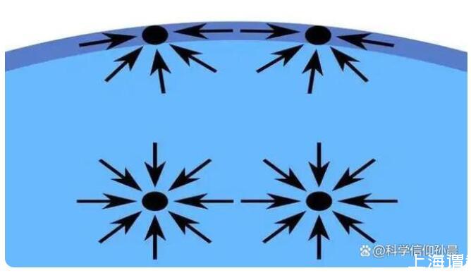 水滴要變成一個(gè)完美的球體,而要想變成一個(gè)完美的球體就必須依靠一個(gè)作用在表面上的力,這個(gè)力就是“表面張力”。
