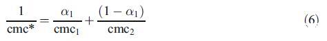 為了討論由兩種二元混合物形成的混合膠束的性質(zhì),即混合膠束是否顯示理想或非理想行為,我們使用了偽相分離模型[19]。根據(jù)該模型,膠束被認(rèn)為是與含有相應(yīng)單體的溶液平衡的宏觀相。對(duì)于二元表面活性劑混合物,理想cmc由方程[19]關(guān)聯(lián):