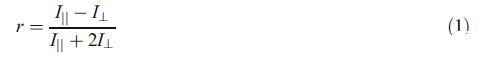 所有熒光各向異性測(cè)量均在25.0±0.2°C下使用來自美國(guó)的熒光偏振儀器系統(tǒng)(Beacon-2000)進(jìn)行。該儀器配備了100W鹵素?zé)糇鳛榧ぐl(fā)源。羅丹明B(RB)作為熒光探針,其濃度保持在1μM。我們還在12mM純表面活性劑濃度下進(jìn)行了10 nM至2μM探針濃度的各向異性測(cè)量(數(shù)據(jù)未顯示)。選擇飽和r值(探針完全與膠束結(jié)合)下的探針濃度(1μM)作為實(shí)驗(yàn)條件。純和二元混合物的表面活性劑總濃度為12mM。分別使用570和630nm的激發(fā)和發(fā)射波長(zhǎng)測(cè)量熒光各向異性。當(dāng)發(fā)射偏振器平行或垂直于偏振激發(fā)方向定向時(shí)?,分別地各向異性是強(qiáng)度差I(lǐng)kI的比率?總強(qiáng)度Ikt2I?如等式1所示: