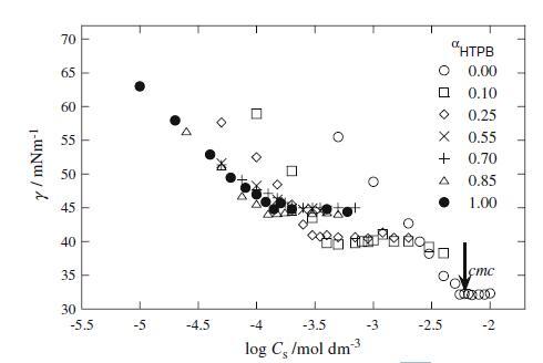 圖1界面張力γ與log Cs/mol dm的關(guān)系圖?3.對(duì)于HTPB+Mega-10混合體系,在不同α
