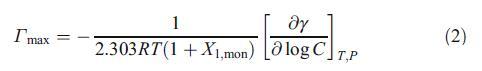 其中γ、C、R、T、P和X1、mon分別為界面張力、表面活性劑濃度、理想氣體常數(shù)、溫度、壓力和陽(yáng)離子表面活性劑(HTPB)的單層組成。在等式2中,我們考慮了界面處反離子的吸附,以計(jì)算Γmax。界面上表面活性劑物種占據(jù)的平均最小面積Amin然后通過以下方程進(jìn)行評(píng)估: