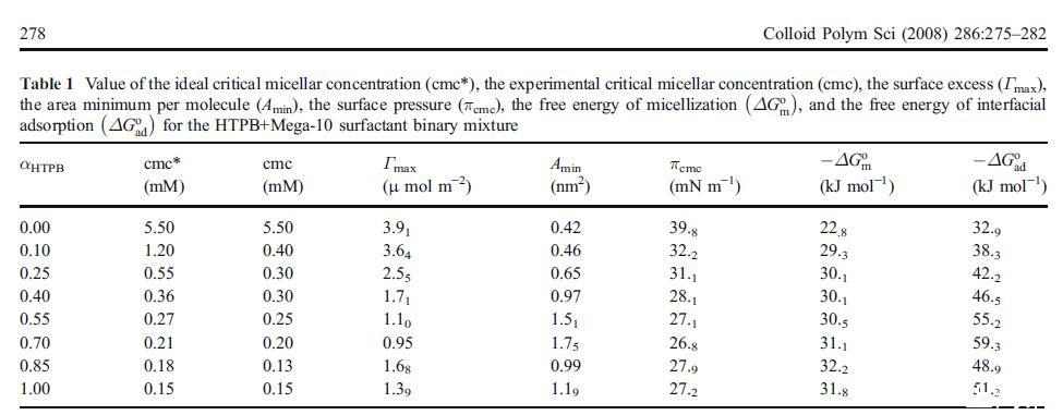 在這項(xiàng)工作中,我們給出了純HTPB和Mega-10及其不同比例的二元混合物的實(shí)驗(yàn)結(jié)果。首先,我們進(jìn)行了界面張力測(cè)量,以確定HTPB+Mega-10純混合物和二元混合物的混合cmc和界面熱力學(xué)參數(shù)。根據(jù)不同的熱力學(xué)模型分析了混合cmc的數(shù)據(jù)。其次,進(jìn)行穩(wěn)態(tài)熒光測(cè)量,以確定膠束的聚集數(shù)和極性,以及它們的斯特恩-沃默結(jié)合常數(shù),取決于溶液組成。最后,我們研究了羅丹明B(RB)的極化,以監(jiān)測(cè)不同HTPB摩爾比下混合膠束的剛性。
