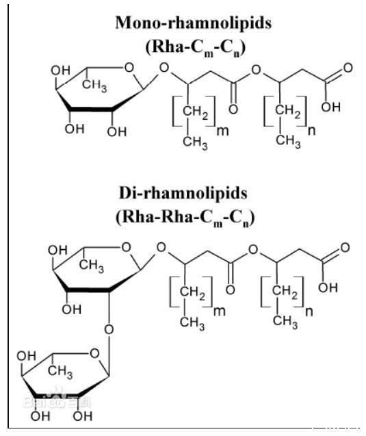 鼠李糖脂的結(jié)構(gòu)多達(dá)幾十種,一般在學(xué)術(shù)界經(jīng)??吹诫p鼠李糖脂和單鼠李糖脂的表述。