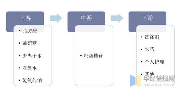 從產(chǎn)業(yè)鏈來看,烷基糖苷產(chǎn)業(yè)鏈由上游原材料、中游生產(chǎn)制造、下游應(yīng)用領(lǐng)域三部分構(gòu)成。產(chǎn)業(yè)鏈上游原材料主要包括脂肪酸、葡萄糖、去離子水、雙氧水、氫氧化鈉;產(chǎn)業(yè)鏈下游主要應(yīng)用于洗滌劑、個(gè)護(hù)、農(nóng)藥等領(lǐng)域。