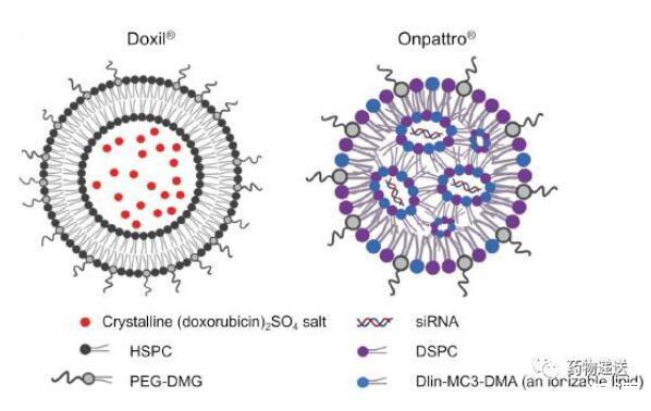 在組成方面,主要成分大致相同,都含有脂質(zhì)和膽固醇,只是脂質(zhì)納米粒所用的脂質(zhì)中必須要有可電離脂質(zhì),而脂質(zhì)體對脂質(zhì)的種類沒有嚴(yán)格要求。但在各成分的比例方面,脂質(zhì)體和脂質(zhì)納米粒存在較大差異,尤其是膽固醇的用量,以經(jīng)典的脂質(zhì)體產(chǎn)品DOXIL為例,HSPC:CHOL:DSPE-PEG2000=3:1:1;而已上市兩款mRNA新冠疫苗的組分中,膽固醇分別占比42.7%(Pfizer/BioNTech)和38.5%(Moderna),明顯高于脂質(zhì)體中膽固醇的含量。