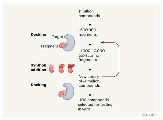 通過重復(fù)對(duì)接和添加合成子的步驟,篩選幾百萬個(gè)化合物來確定hits。隨著每一次迭代,每個(gè)化合物的大小都會(huì)隨著分子變得更加完整而增加。