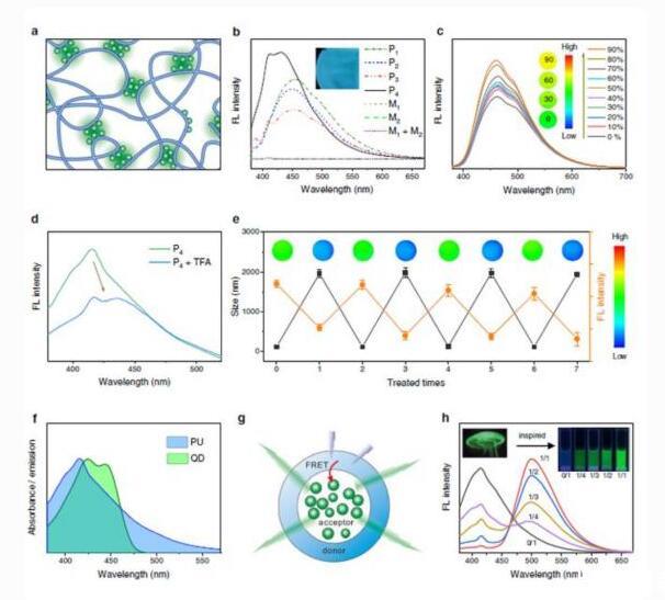 而當(dāng)去除三氟乙酸后,熒光和粒徑又會恢復(fù),并能進(jìn)行多次循環(huán)。這種構(gòu)象介導(dǎo)的變形現(xiàn)象和變色現(xiàn)象,與水母在呼吸時隨著膨脹和收縮,所表現(xiàn)出的熒光轉(zhuǎn)變行為十分相似。