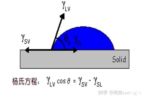 聚合物為固體時,它的表面張力的測定就沒那么簡單了。根據(jù)不同的情形,有幾種不同的方法去測定。一種容易理解的方法是使用兩種液體在固體表面上分別測出接觸角,分別建立楊氏方程,然后聯(lián)立楊氏方程消除未知量。楊氏方程如下: