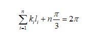 假設(shè)二維干泡沫中的任一氣泡如圖3b所示,氣泡的邊數(shù)為n,從a點(diǎn)開(kāi)始,再回到a的邊長(zhǎng)分別標(biāo)記為l1到ln,每邊所對(duì)應(yīng)的曲率為k1到kn(Plateau第一定律)?,F(xiàn)在假設(shè)有一點(diǎn)從a點(diǎn)沿著邊向b運(yùn)動(dòng),到b點(diǎn)時(shí),所走的路徑為l1,轉(zhuǎn)動(dòng)的角度為這條邊所對(duì)應(yīng)的圓心角(向外為正,向內(nèi)為負(fù)值),為k1*l1。此時(shí)要想繼續(xù)沿著邊運(yùn)動(dòng),需要向內(nèi)轉(zhuǎn)動(dòng)π/3角度(根據(jù)Plateau第二定律),如圖3b所示。轉(zhuǎn)動(dòng)后繼續(xù)運(yùn)動(dòng),直到到達(dá)原來(lái)的點(diǎn)a。此過(guò)程,n條邊總共在頂點(diǎn)處轉(zhuǎn)動(dòng)的角度為nπ/3,在邊上轉(zhuǎn)動(dòng)的角度為